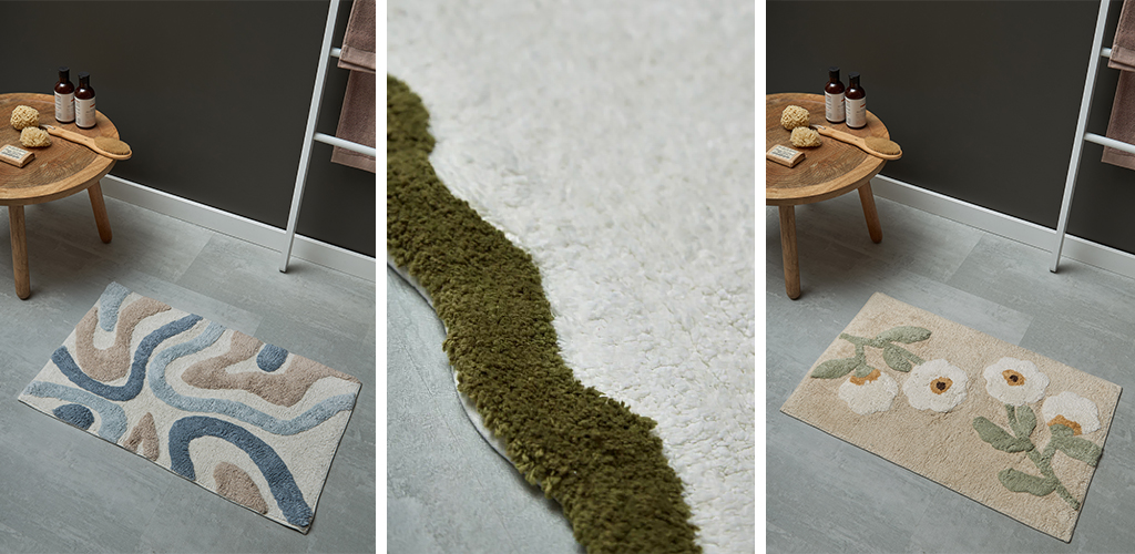 В дополнение к линейке Trendy Ruffles появились коврики с характерным волнистым краем, напоминающим раковины морских гребешков. Они представлены в двух оттенках: оливковом и терракотовом. А линейка Ethnic пополнилась моделями с абстрактным дизайном и стилизованным ботаническим орнаментом.