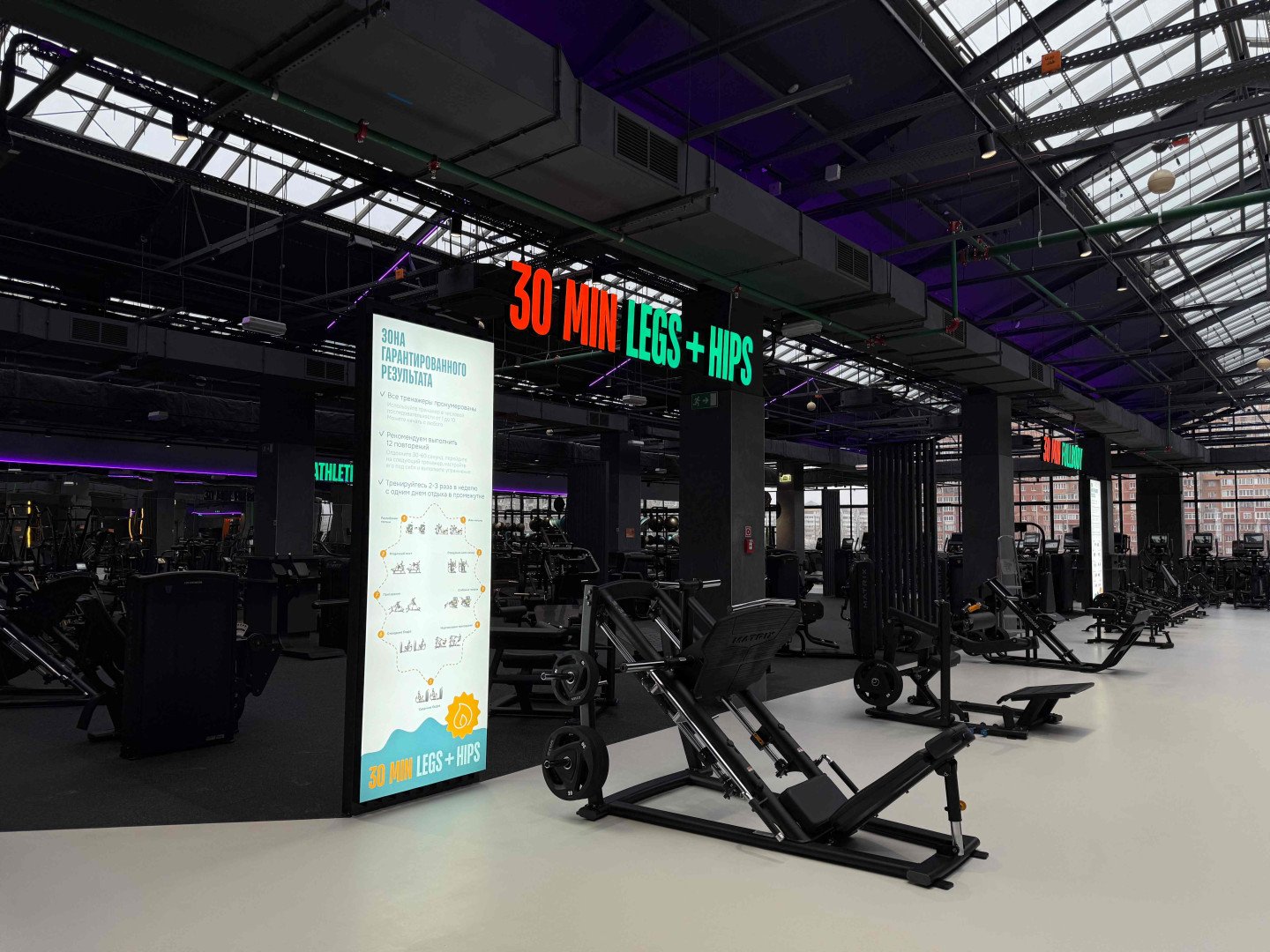 Новый фитнес-объект общей площадью 2 840 кв. м предложил современное пространство для тренировок и отдыха с продуманным зонированием. Просторный тренажерный зал занял 1 680 кв. м и был оснащен более чем 130 единицами силового и кардиооборудования.