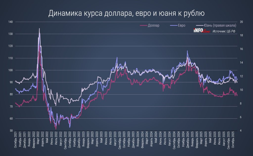 Рубль продолжил укрепляться: в октябре доллар подешевел относительно сентября на 2,4% до 80,9 руб., евро — на 3,3% до 94,3 руб., юань — на 2,6% до 11,3 руб.