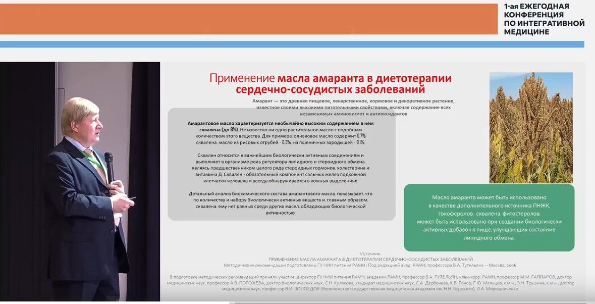 В рамках конференции состоялся симпозиум «Амарант в системе здорового питания и комплексной терапии заболеваний» — при поддержке научно-производственного холдинга «АмарантАгро», производителя полного цикла продуктов из амаранта от поля до готовой продукции.