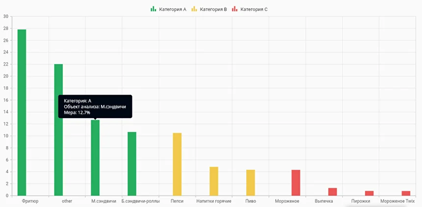 ABC-анализ распределяет товары на группы A, B и C в зависимости от их вклада в прибыль. Вы сможете выделить как наиболее прибыльные позиции, так и товары-аутсайдеры.