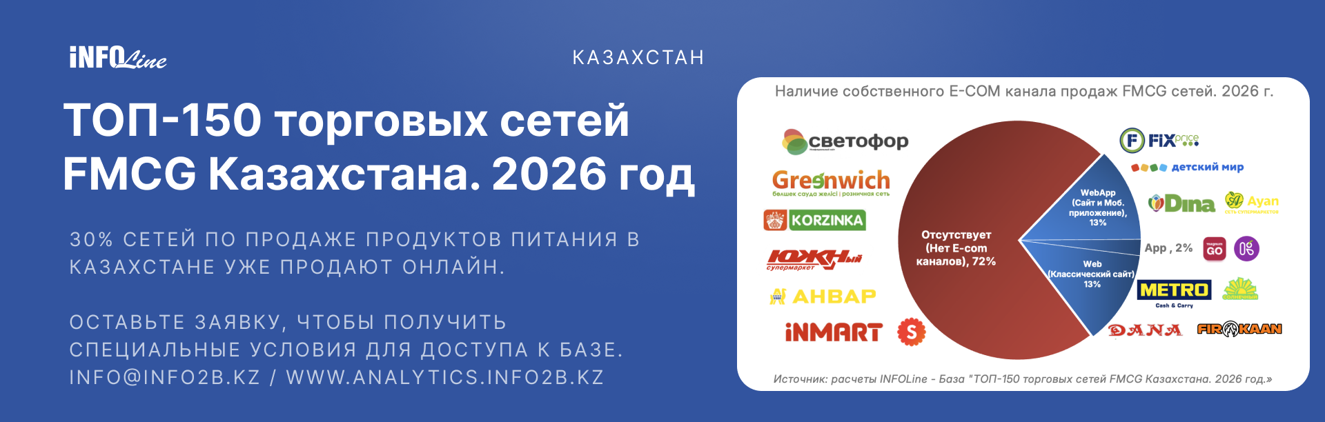 В ходе работы над исследованием «Топ-150 торговых сетей FMCG Казахстана. 2026 год» специалисты INFOLine оценили сформировавшийся в Казахстане рынок e-grocery. Торговые сети, представленные в онлайн-канале, нарастили трафик, а их конкуренты, не настроившие дистанционных продаж, потеряли покупателей.