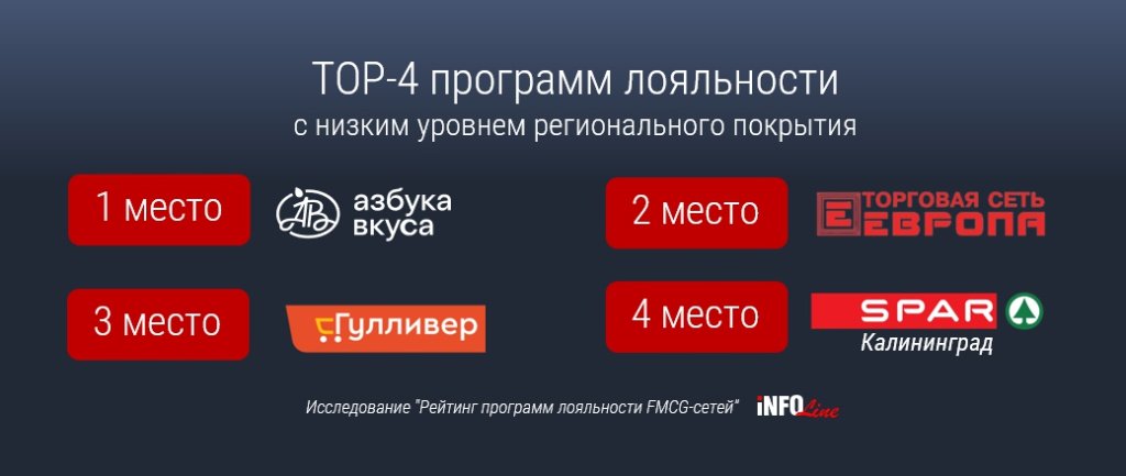 В группе локальных сетей с покрытием менее 10 регионов лидером стала программа лояльности «Вкусомания» сети «Азбука Вкуса». Также в Top-4 вошли «Город товаров» сети «Европа», «Чудокарта» от «Гулливера» и «Клуб друзей» от ГК «Спар-Калининград».