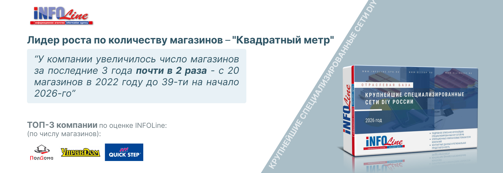В тройку крупнейших компаний по числу магазинов вошли «Полдома», «Управдом» и Quick-Step. Суммарно на первую тройку пришлось около 400 торговых точек. Лидером по росту числа объектов стала компания «Квадратный метр» — одна из ведущих розничных сетей в Центральном Черноземье и на Юге России, увеличившая число магазинов за последние три года почти в 2 раза — с 20 магазинов в 2022 году до 39-ти на начало 2026-го.