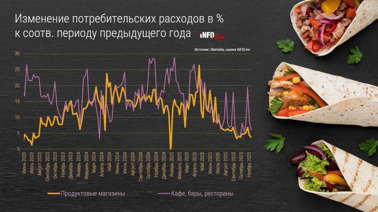 По оценкам INFOLine, оборот рынка общественного питания России за 10 месяцев 2025 года вырос на 8-9% в сопоставимых ценах, достигнув почти 5 трлн рублей.