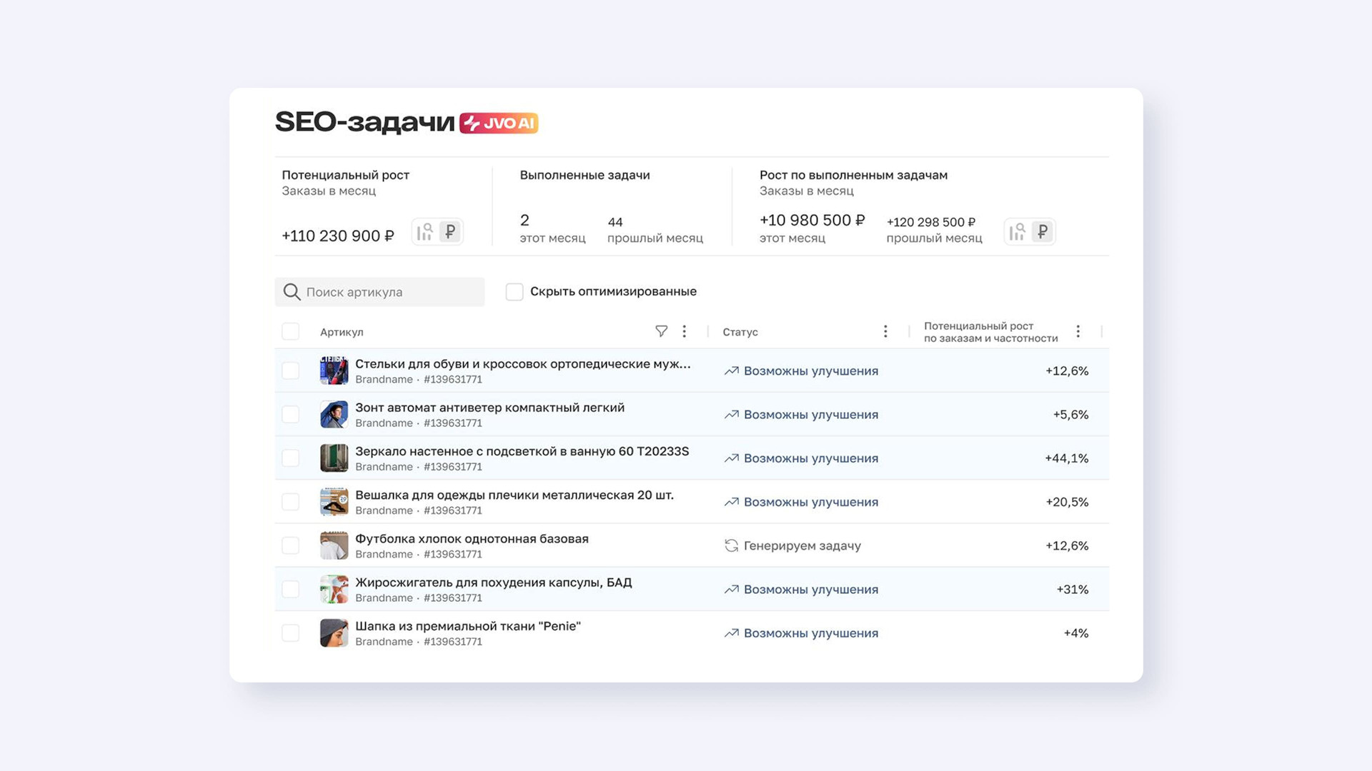 Для карточек со статусом "Возможны улучшения" SEO PRO с JVO AI автоматически подбирает новые наиболее эффективные ключевые слова к добавлению на основе больших данных и лексического анализа всех поисковых запросов по частотности, распределяя их на релевантные и минус слова.