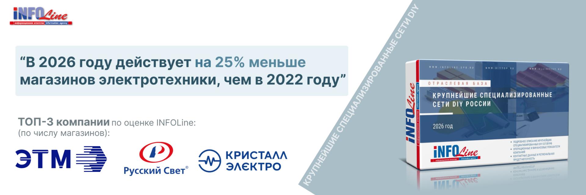 По данным из отраслевой базы INFOLine «300 крупнейших специализированных торговых сетей DIY России. 2026 год», в сегменте электротехнических товаров в начале 2026 года действует более 17,4 тыс. магазинов, что на 25% меньше, чем в 2022 году, когда их было более 23,5 тыс.