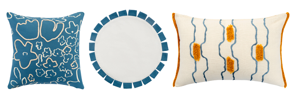 «Незабудки» и «Ритм» — две линейки текстиля со сквозным дизайном, который повторяется на декоративных подушках, салфетках и дорожках на стол. Сочетать такие паттерны можно практически с любым современным интерьером. А круглую салфетку «Контур» можно использовать как рифму к любой из этих линеек.