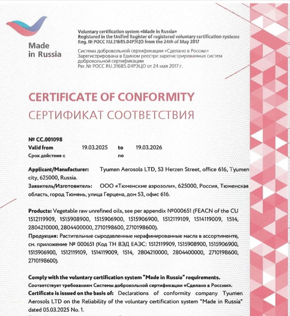 Мы в числе первых, кто получил этот сертификат в Тюменской области среди малого бизнеса. Для завода «Тюменские аэрозоли» это достижение стало очередным подтверждением лидерских позиций в отрасли и приверженности самым высоким стандартам качества. Мы гордимся этим достижением и будем и дальше радовать вас качественной, надежной и безопасной продукцией!