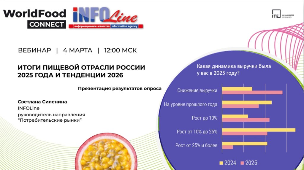 Результаты совместного исследования агентства INFOLine и сообщества WorldFood Connect были представлены в ходе вебинара «Итоги пищевой отрасли России 2025 года и тенденции 2026». Мероприятие прошло 4 марта в online-формате.
