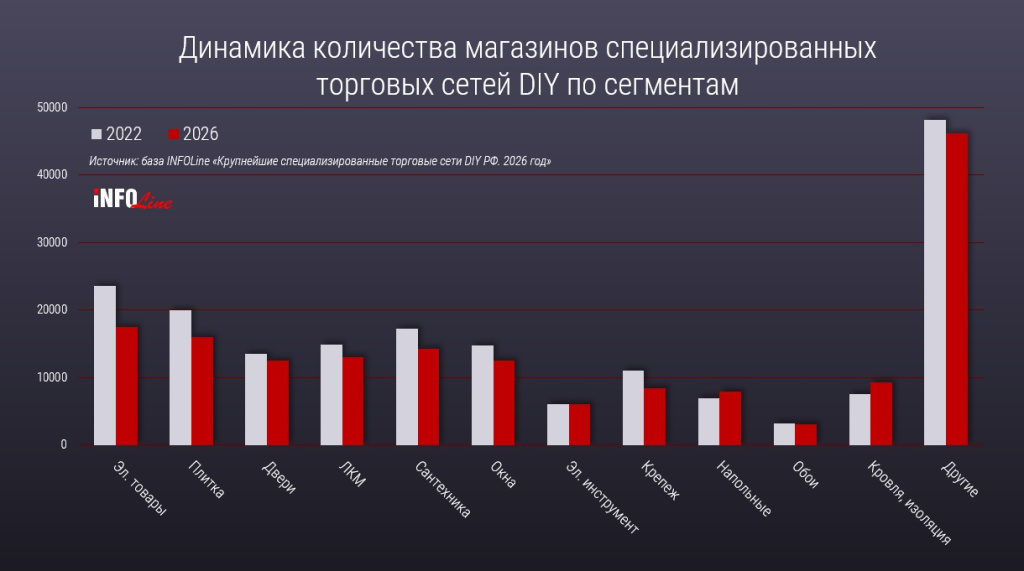 По словам основателя INFOLine Ивана Федякова, тенденция на сужение специализированной DIY-розницы наблюдалась и в предыдущие годы. Во многом это было связано с развитием крупных универсальных сетей с более низкими ценами.