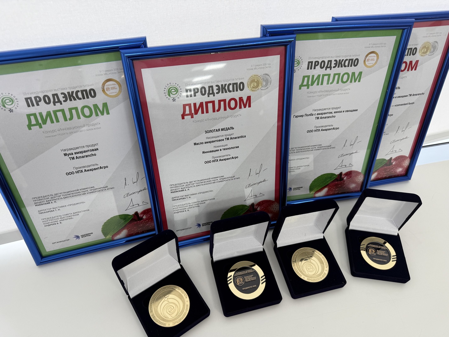 На выставке «Продэкспо-2026» НПХ «АмарантАгро» получил три «золота» и «серебро». В номинации «Продукты для здорового образа жизни» награждены амарантовые гарниры в варочных пакетах и амарантовая мука Amarancho, изготовленная по ГОСТ Р 71907-2024. В номинации «Инновации в технологии» медаль высшей пробы присуждена амарантовому маслу Amarantica. Серебряной медалью в категории «Инновации в удобстве потребления» отмечен гарнир с амарантом Amarancho.